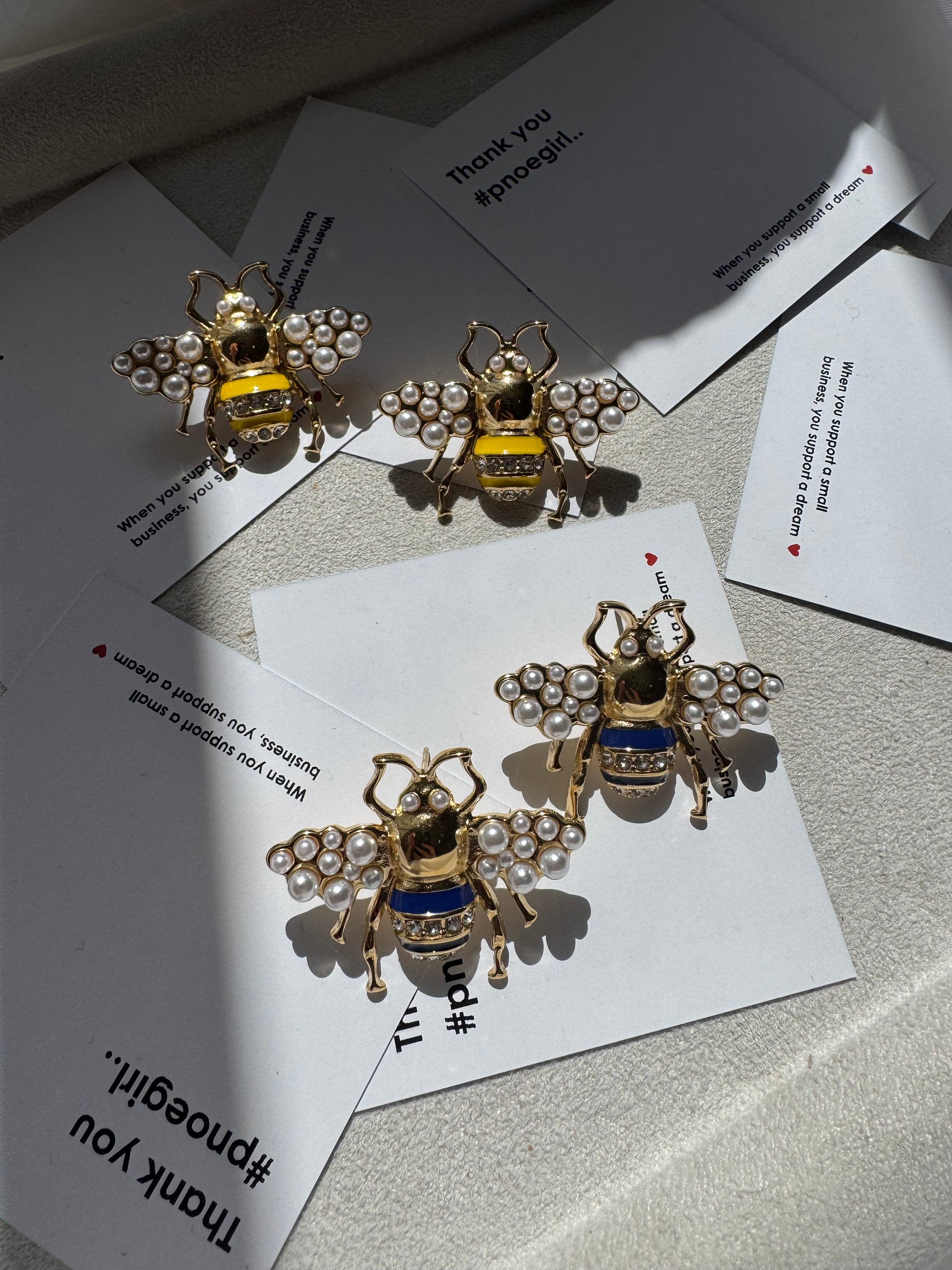 Για τις γυναίκες που δεν ακολουθούν το σμήνος. Αυτά τα statement σκουλαρίκια-μέλισσες αποπνέουν πολυτέλεια, παιχνιδιάρικη διάθεση και βασιλική αυτοπεποίθηση. Το σώμα τους σε δύο αποχρώσεις, Imperial Blue και Sunlit Yellow, ενώ τα φτερά τους είναι στολισμένα με πέρλες που μαγνητίζουν το φως.