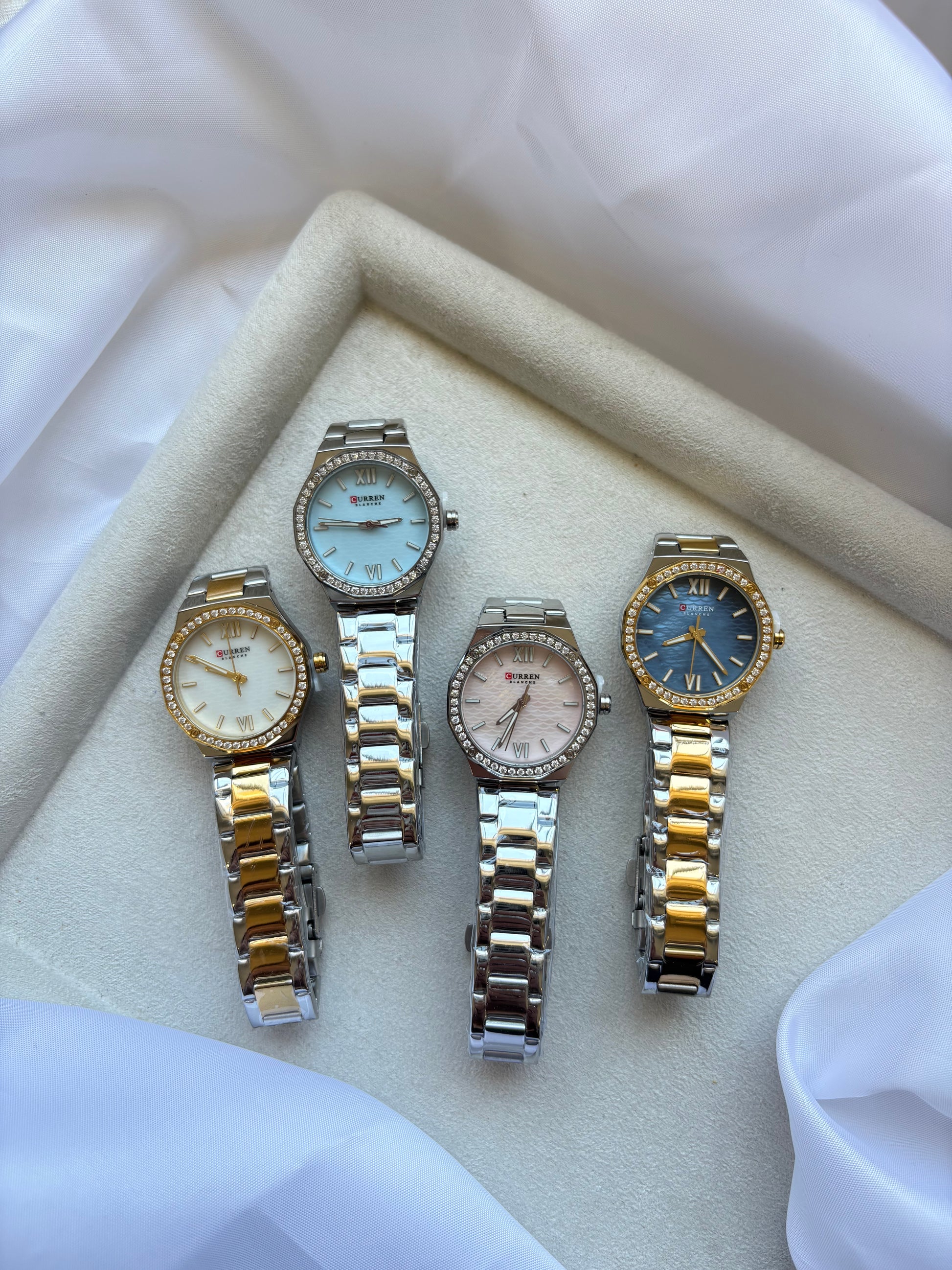 Τέσσερα ρολόγια που αποπνέουν πολυτέλεια και διαχρονικό στυλ. Η συλλογή "Queen" συνδυάζει ατσάλι και επιχρυσωμένες λεπτομέρειες, με λαμπερή στεφάνη από διακριτικά στρας και καντράν σε αποχρώσεις πάγου, μαργαριταριού, ροζ και navy blue.