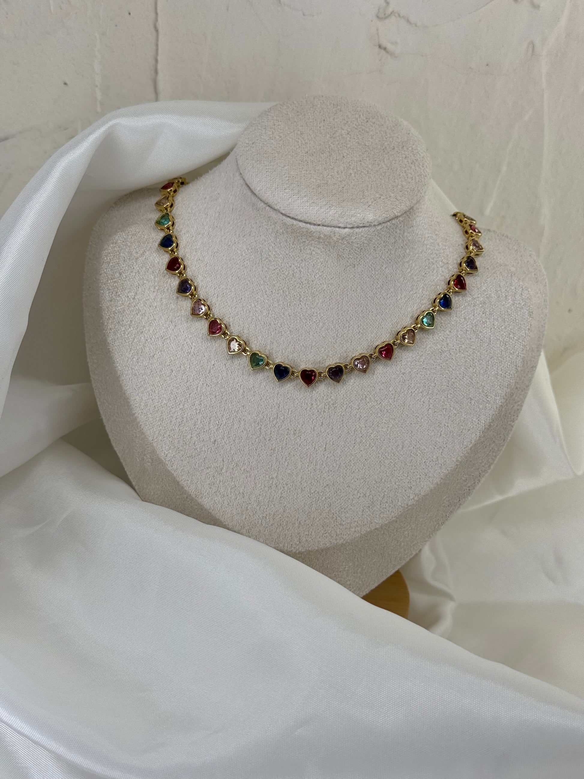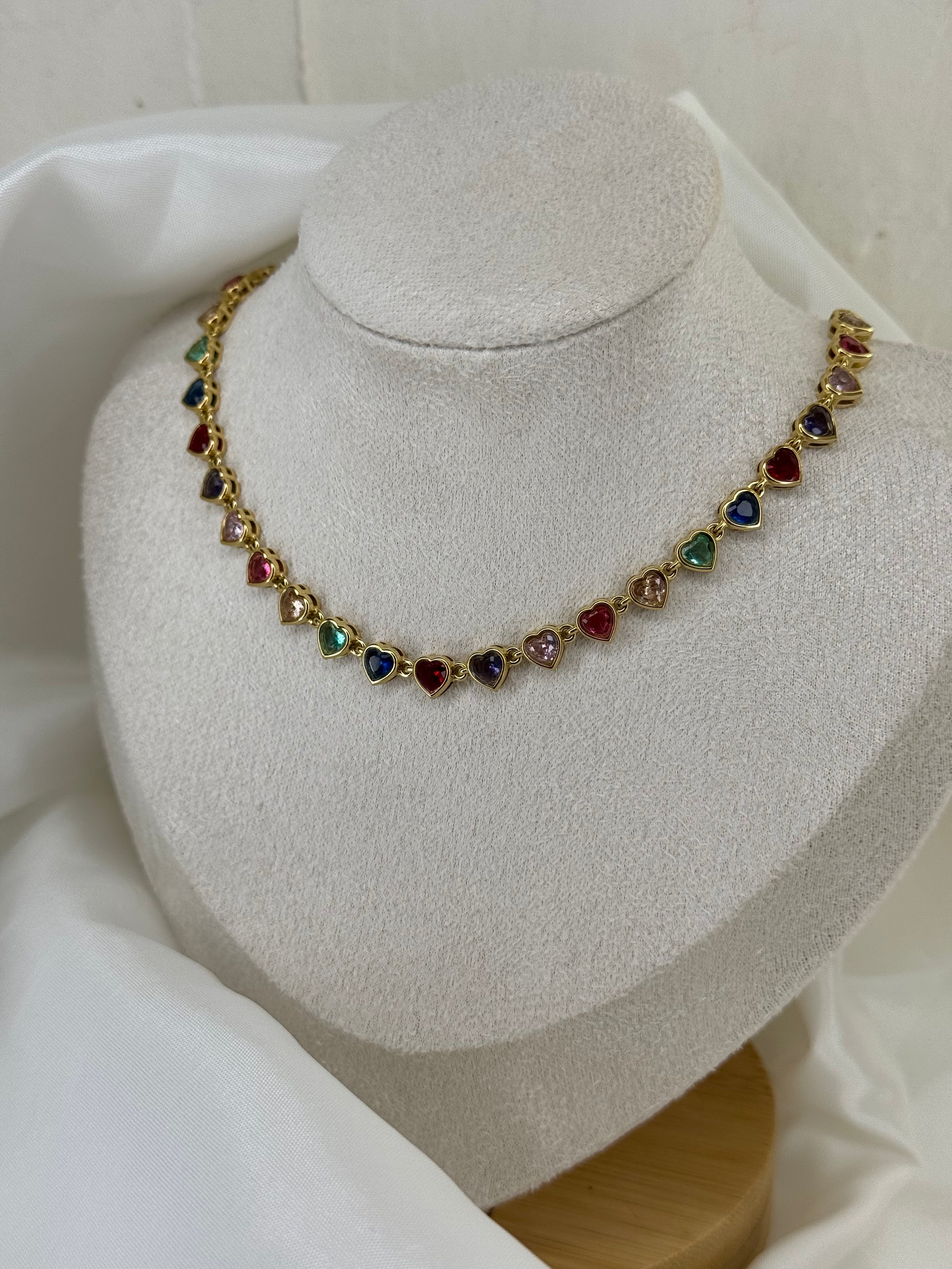 Ένα κολιέ γεμάτο χρώμα και αγάπη. Η χρυσή αλυσίδα στολίζεται με μικρές καρδιές σε πολύχρωμες αποχρώσεις, δημιουργώντας ένα μοναδικό κόσμημα που ακτινοβολεί χαρά και ζωντάνια. Ένα playful αλλά και κομψό σχέδιο που μπορεί να φορεθεί καθημερινά ή να δώσει μια ξεχωριστή πινελιά σε πιο elegant εμφανίσεις.
