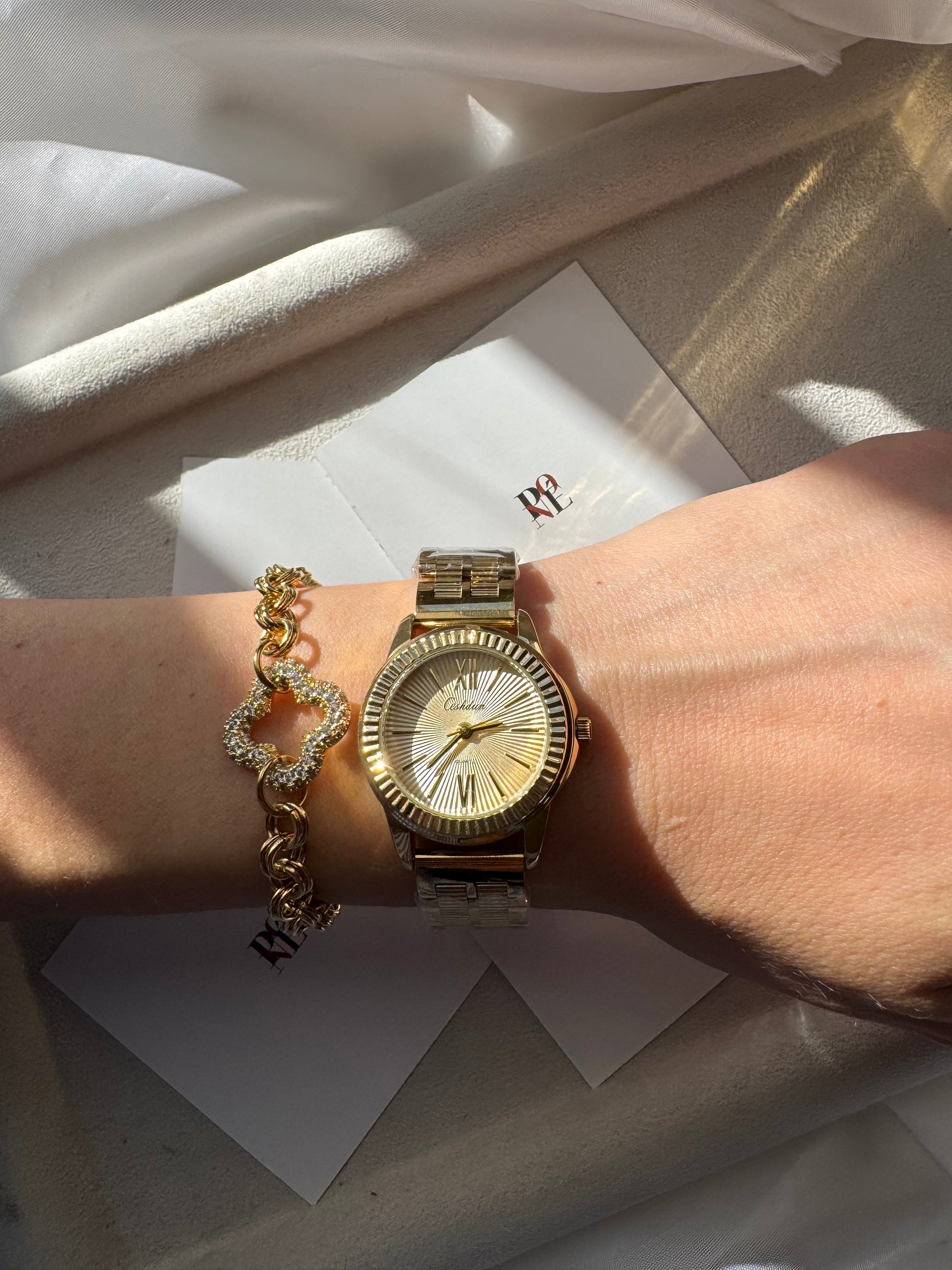 Ένα ρολόι εμπνευσμένο από τις χρυσές ακτίνες του ήλιου. Το στρογγυλό χρυσό καντράν πλαισιώνεται από ένα κομψό ανάγλυφο περίγραμμα, που παίζει με το φως και αναδεικνύει τη μοναδικότητά του. Η λαμπερή χρυσή απόχρωση συνδυάζει διαχρονική πολυτέλεια με σύγχρονη αισθητική, χαρίζοντας λάμψη σε κάθε σας στιγμή.