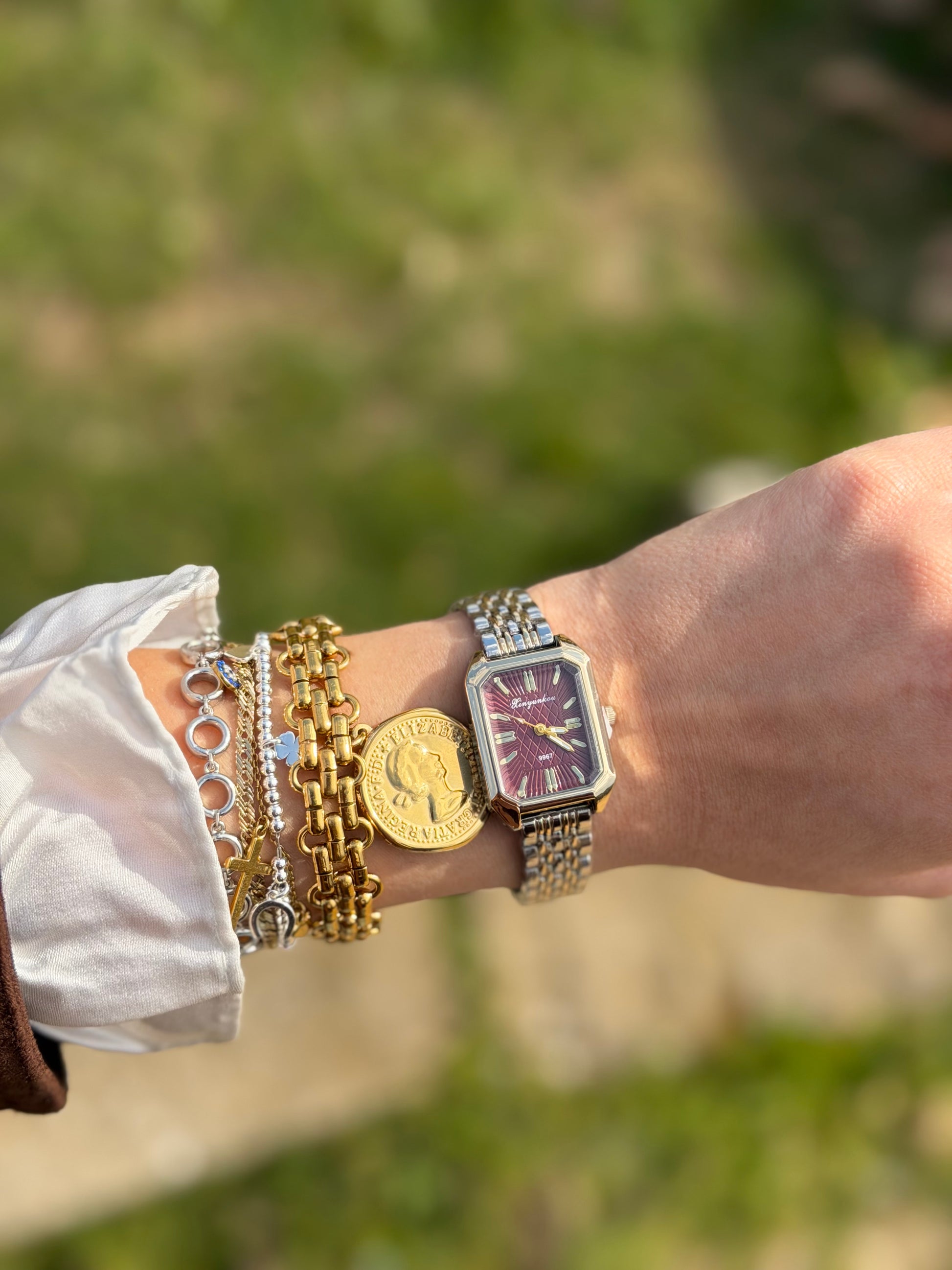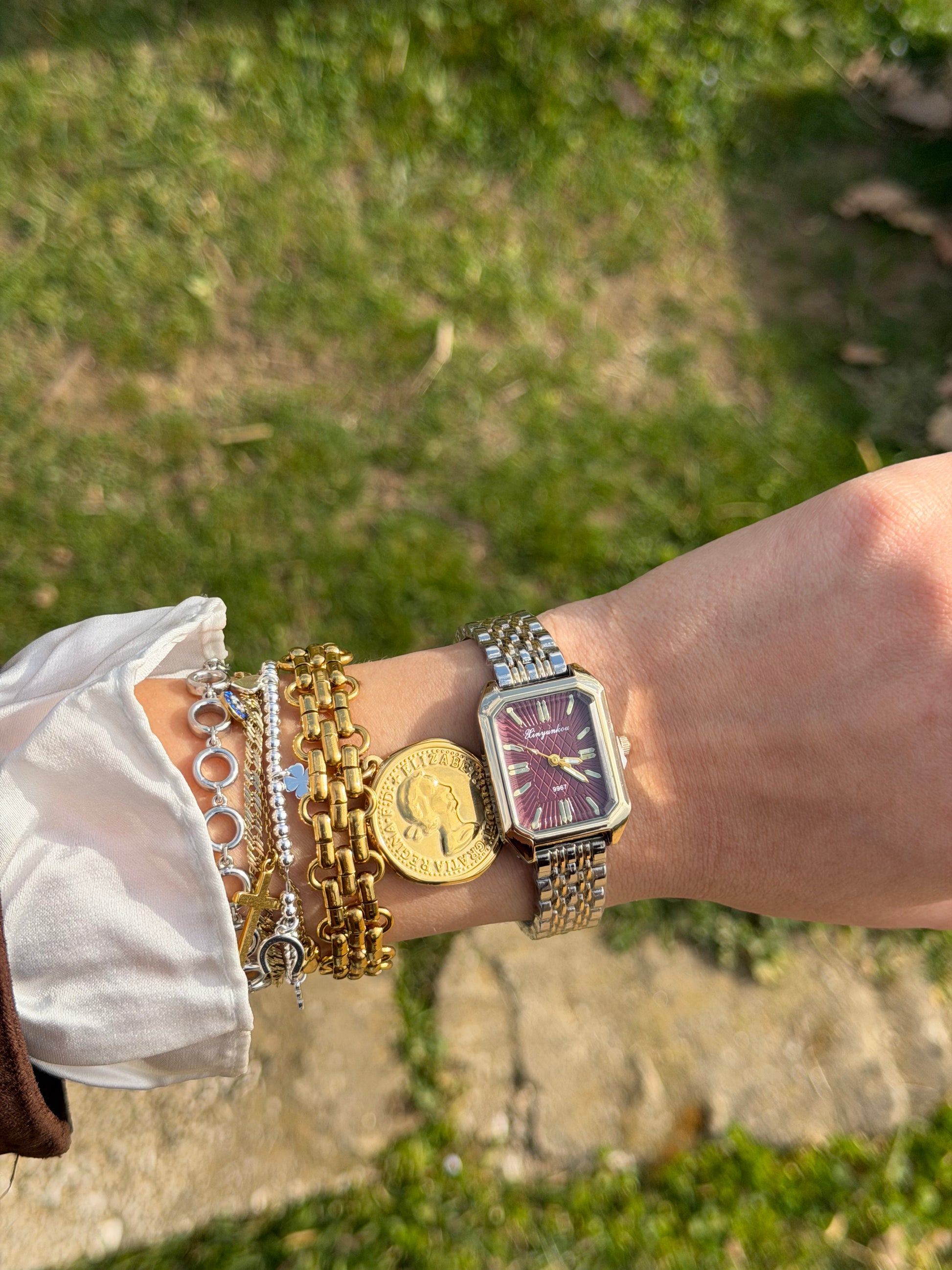 Το ρολόι Rosalie ξεχωρίζει για το ιδιαίτερο ορθογώνιο σχήμα του και το βαθύ δαμασκηνί καντράν με την ανάγλυφη υφή, που του προσδίδει έναν αέρα πολυτελείας άλλης εποχής. Κατασκευασμένο από stainless steel σε bicolor (ασημί-χρυσό) μπρασελέ, είναι το ιδανικό κομμάτι για να δημιουργήσετε το απόλυτο "watch stacking" by Pnoe.