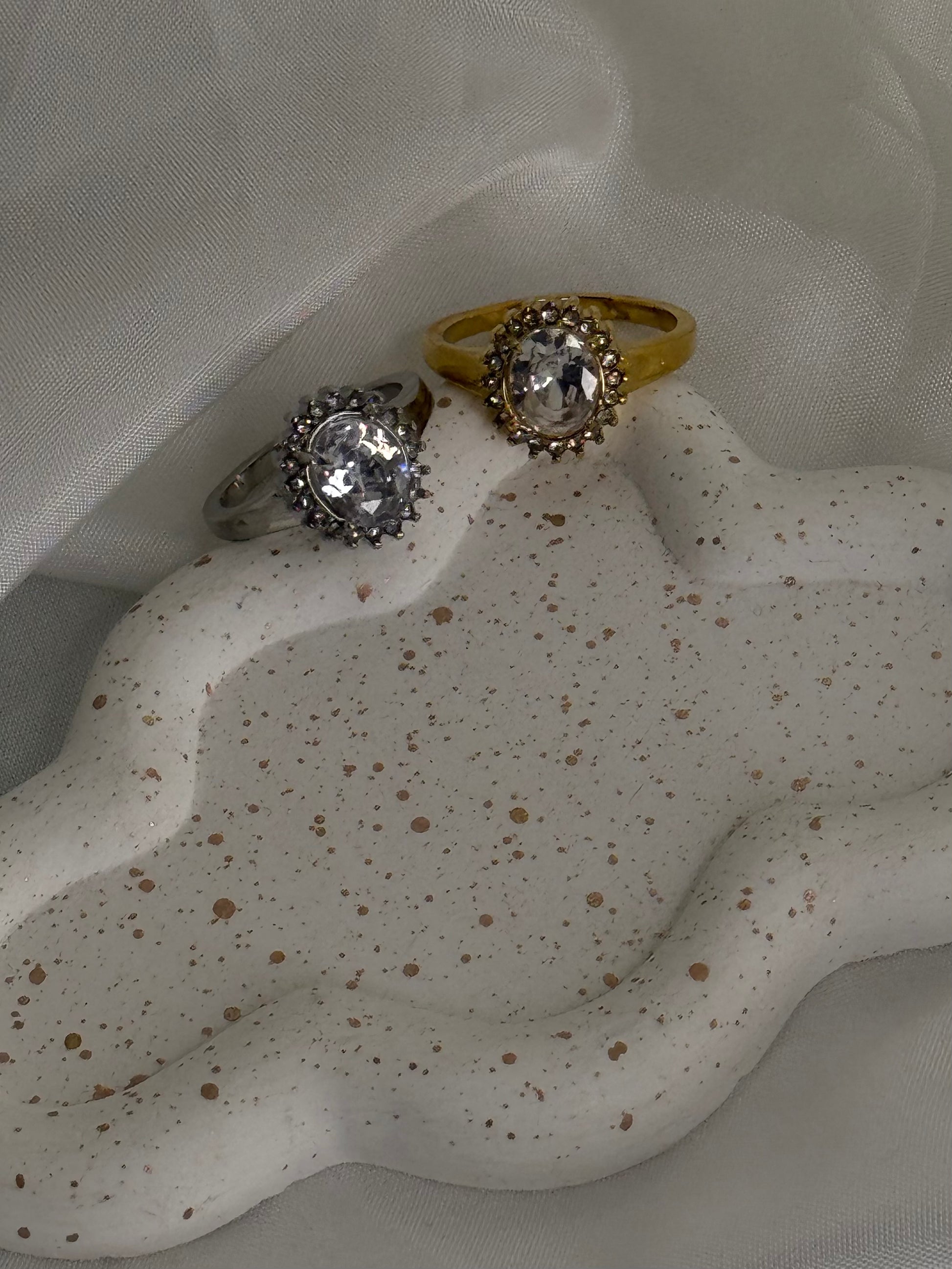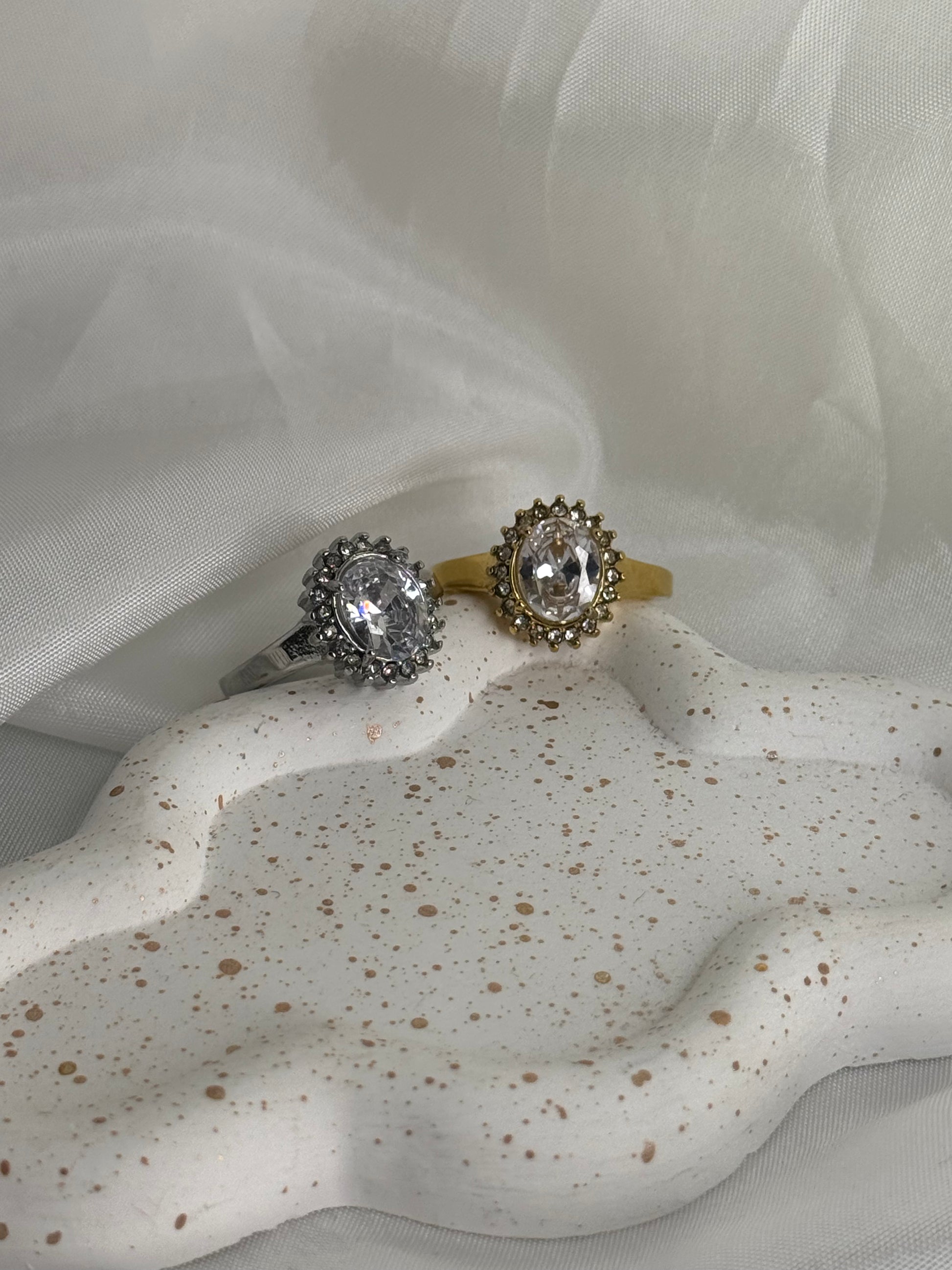 Το Royal Glow Ring ξεχωρίζει για τη βασιλική του λάμψη και το εντυπωσιακό του design. Η μεγάλη οβάλ zircon πέτρα στο κέντρο, πλαισιωμένη από μικρότερες που σχηματίζουν στεφάνι, χαρίζει μοναδική κομψότητα και λάμψη σε κάθε εμφάνιση. Ένα statement δαχτυλίδι που αποπνέει πολυτέλεια και αυτοπεποίθηση.