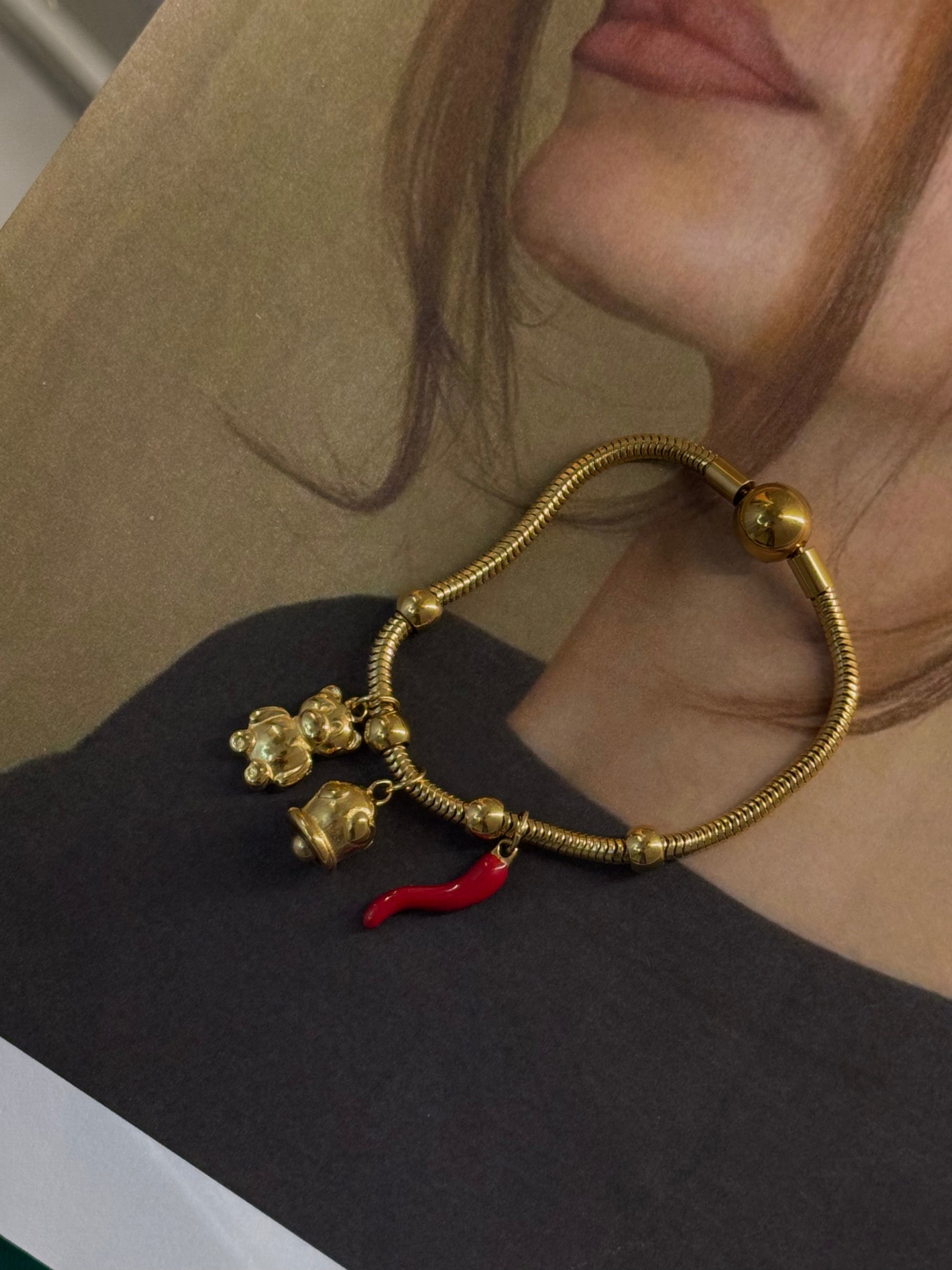 Το Scarlet Pop είναι ένα βραχιόλι που προσθέτει χρώμα, ενέργεια και προσωπικότητα σε κάθε εμφάνιση. Η χρυσή βάση από ανοξείδωτο ατσάλι συνδυάζεται με παιχνιδιάρικα charms και μια έντονη κόκκινη λεπτομέρεια που λειτουργεί σαν fashion “pop”, μικρό, αλλά απόλυτα αισθητό. Σχεδιασμένο για καθημερινή χρήση, φοριέται άνετα μόνο του ή σε layering, μετατρέποντας ένα απλό look σε statement με χαρακτήρα. Ένα κόσμημα που δεν ακολουθεί τη διάθεση, τη δημιουργεί.