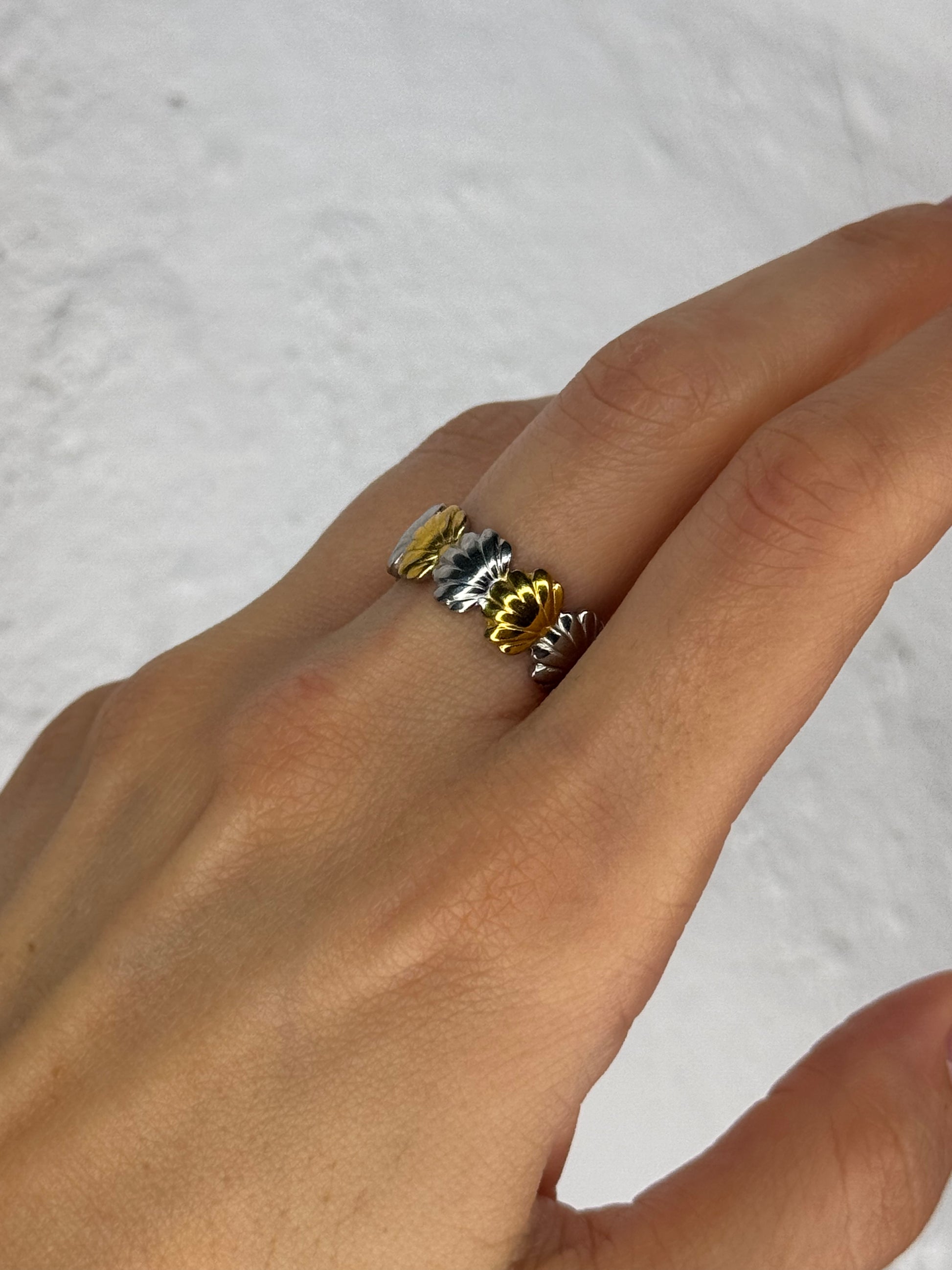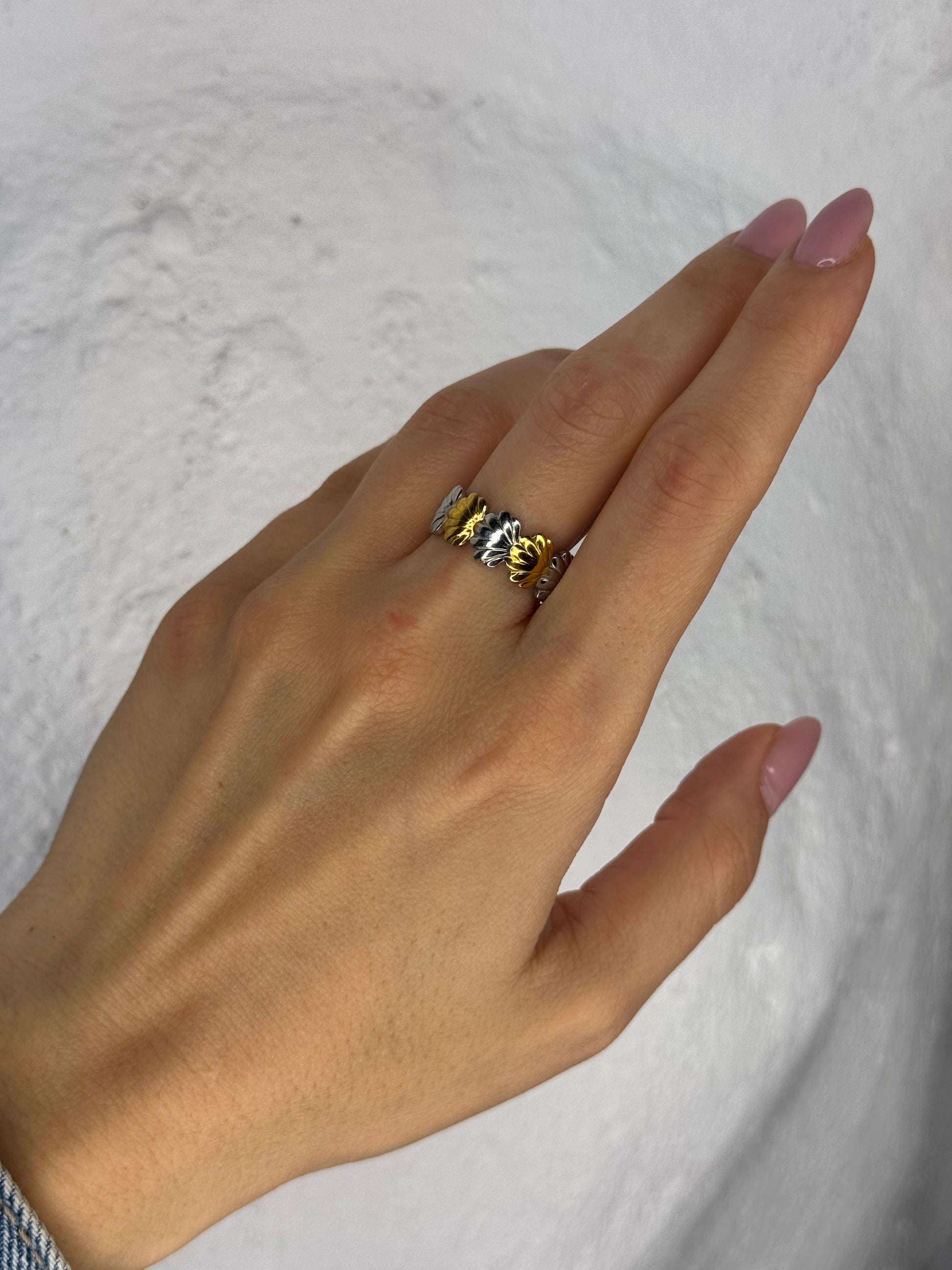 Το Sea Whispers είναι ένα δαχτυλίδι εμπνευσμένο από τη θάλασσα, ένα μοτίβο κοχυλιού σε δύο αποχρώσεις, χρυσό και ασημί, που αποπνέει καλοκαιρινή αύρα και ανεπιτήδευτη κομψότητα. Ιδανικό για να προσθέσεις μια πινελιά παραλίας στην καθημερινότητά σου.