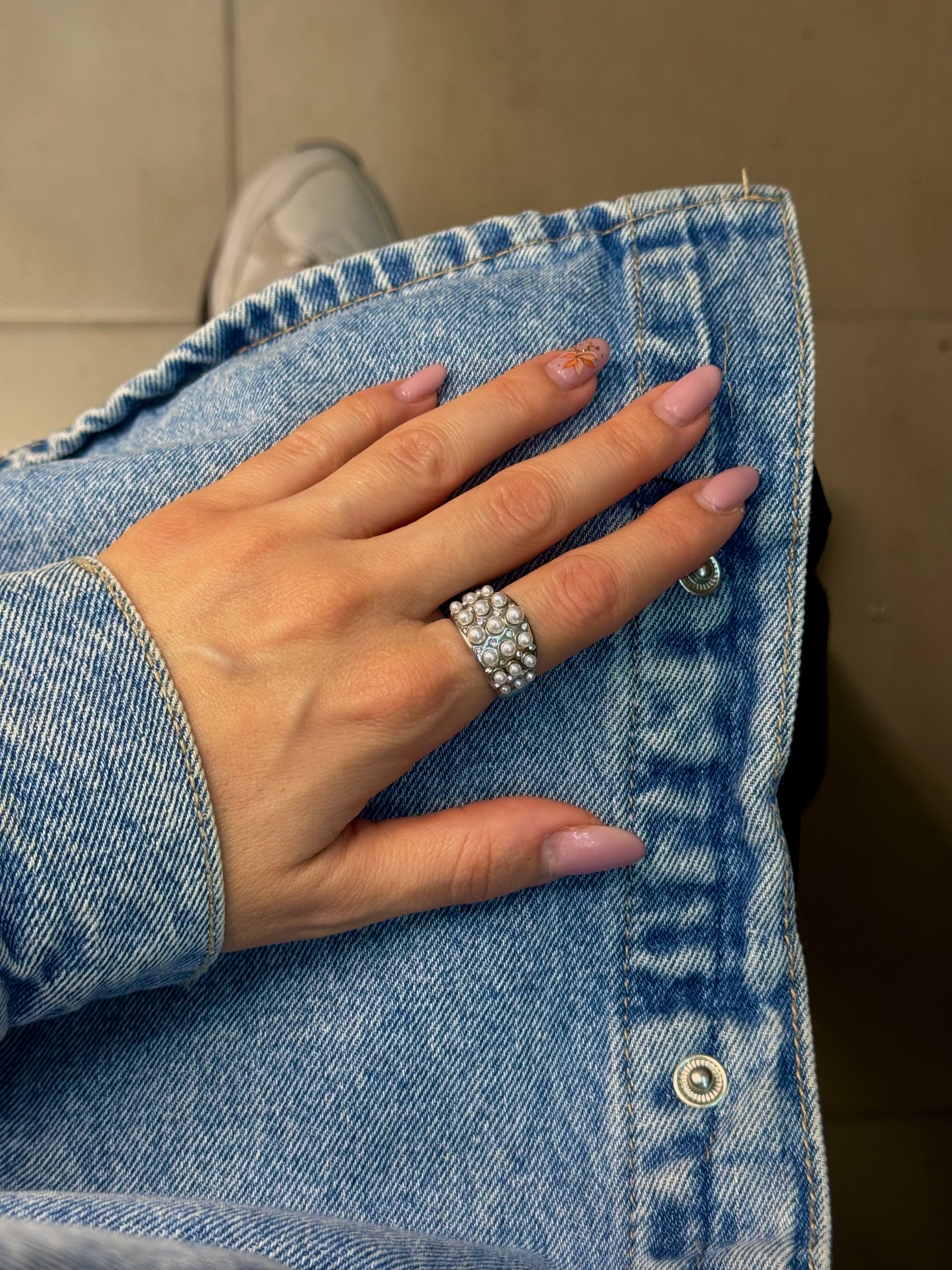 Ένα δαχτυλίδι με παρουσία. Επιβλητικό αλλά κομψό, στολισμένο με δεκάδες μικρές πέρλες που δημιουργούν μια ανάγλυφη επιφάνεια, σαν στέμμα που αγκαλιάζει το δάχτυλο. Το Royal Pearl είναι η απόλυτη δήλωση θηλυκής δύναμης: bold, elegant, timeless. Δεν το φοράς απλά. Το εκπέμπεις.