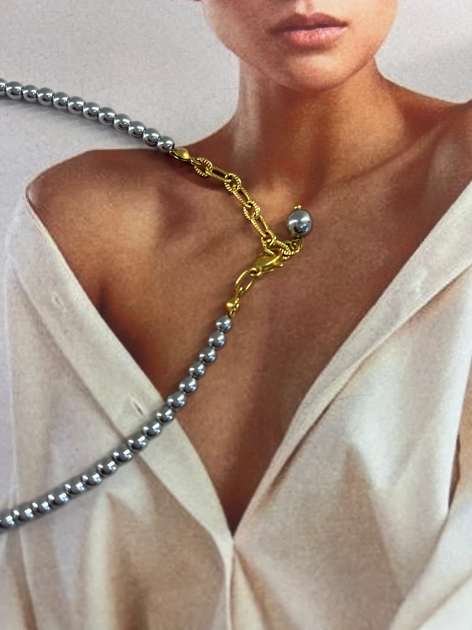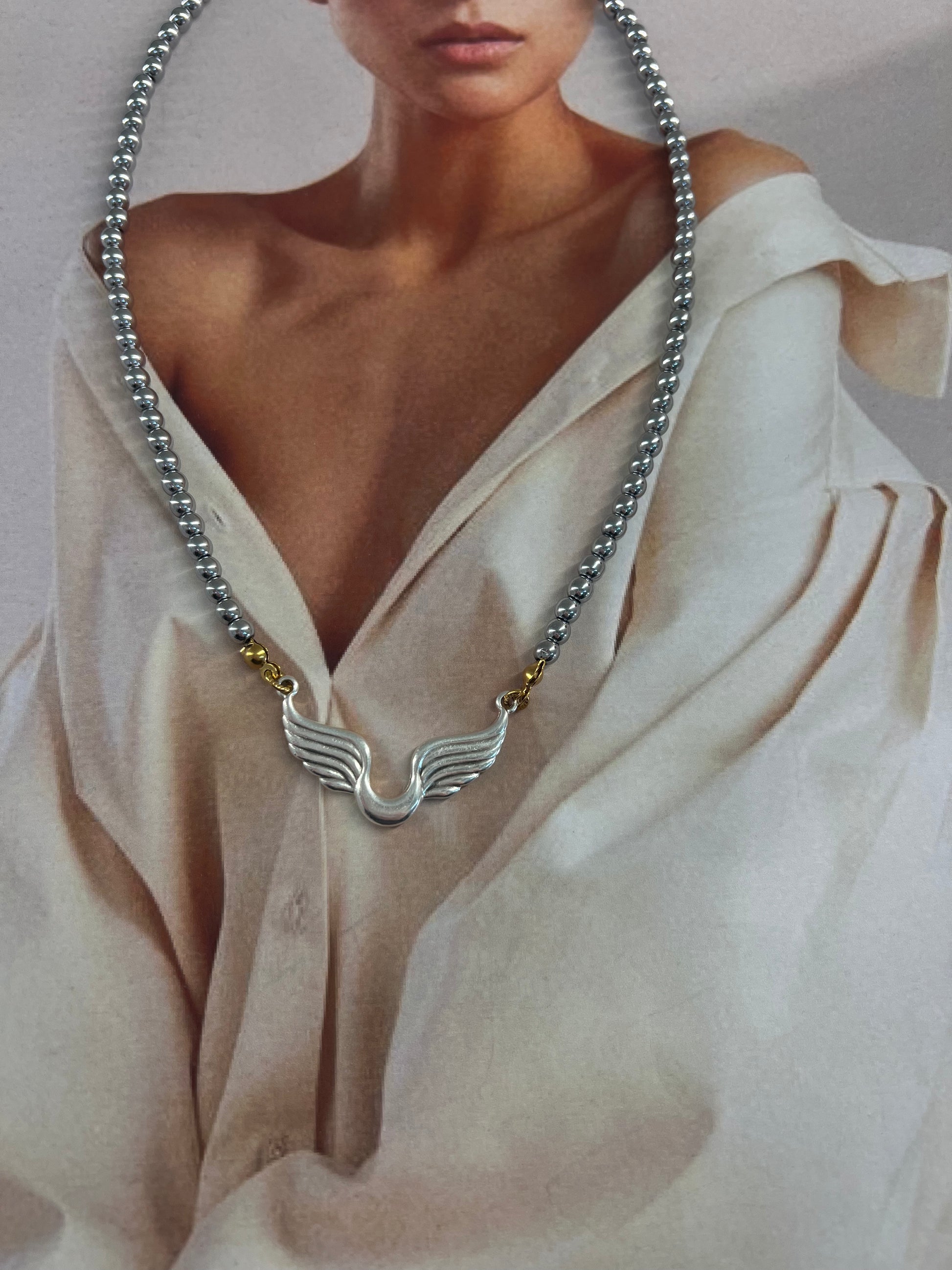 Αυτό το κολιέ αποτυπώνει τη δύναμη και τη γαλήνη των φτερών μέσα από έναν μίνιμαλ αλλά επιβλητικό σχεδιασμό. Οι αιματίτες σε ασημί τόνο χαρίζουν μεταλλική λάμψη και ισορροπία, ενώ το μοτίβο των φτερών στο κέντρο αποπνέει αίσθηση ελευθερίας και κίνησης. Οι χρυσές λεπτομέρειες και η αλυσίδα στο τελείωμα προσθέτουν μία ζεστή αντίθεση που κάνει το κόσμημα να ξεχωρίζει, ένα statement κομμάτι για γυναίκες με αυτοπεποίθηση και στιλ.