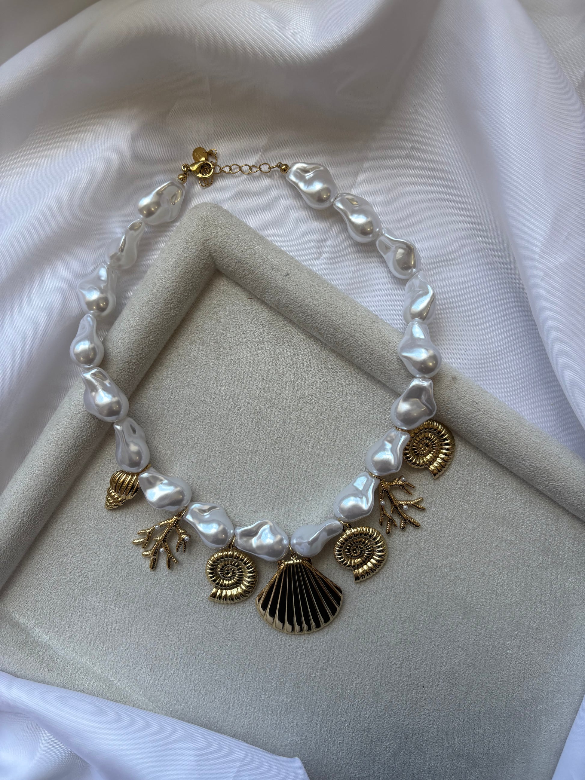 Ένα κολιέ εμπνευσμένο από τις γοργόνες και τα μυστικά της θάλασσας. Οι πέρλες σε φυσική φόρμα συναντούν χρυσά στοιχεία-σύμβολα του καλοκαιριού: κοχύλια, κοράλλια και σπείρες που μοιάζουν να ήρθαν κατευθείαν από τον βυθό.