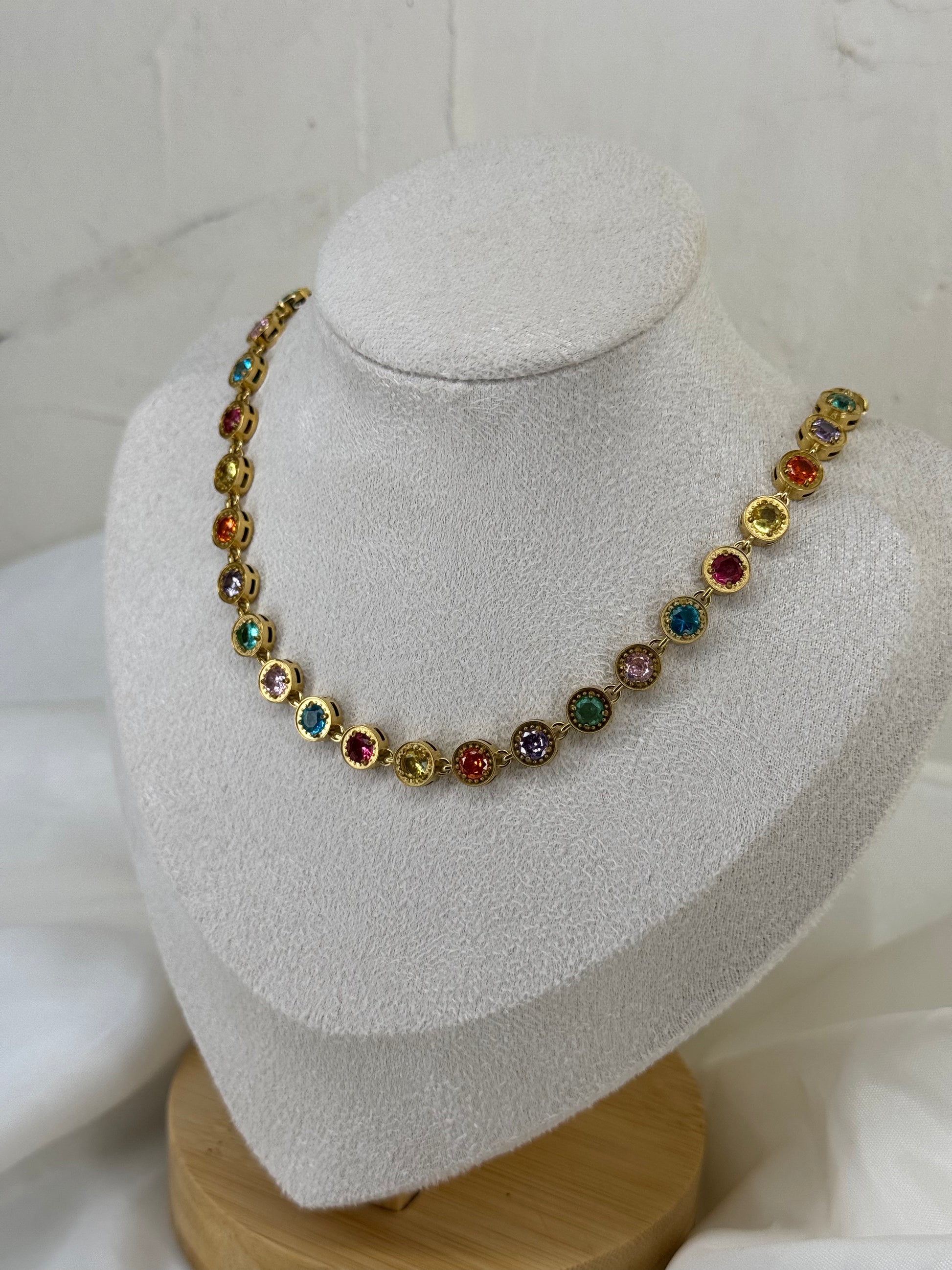 Ένα κολιέ που αιχμαλωτίζει όλα τα χρώματα του φωτός. Η χρυσή του βάση αγκαλιάζει πολύχρωμες πέτρες σε κυκλικό σχήμα, δημιουργώντας ένα εντυπωσιακό αποτέλεσμα που ακτινοβολεί ζωντάνια και κομψότητα. Ιδανικό για να φωτίσει κάθε εμφάνιση, από το καθημερινό ως το πιο glamorous look.