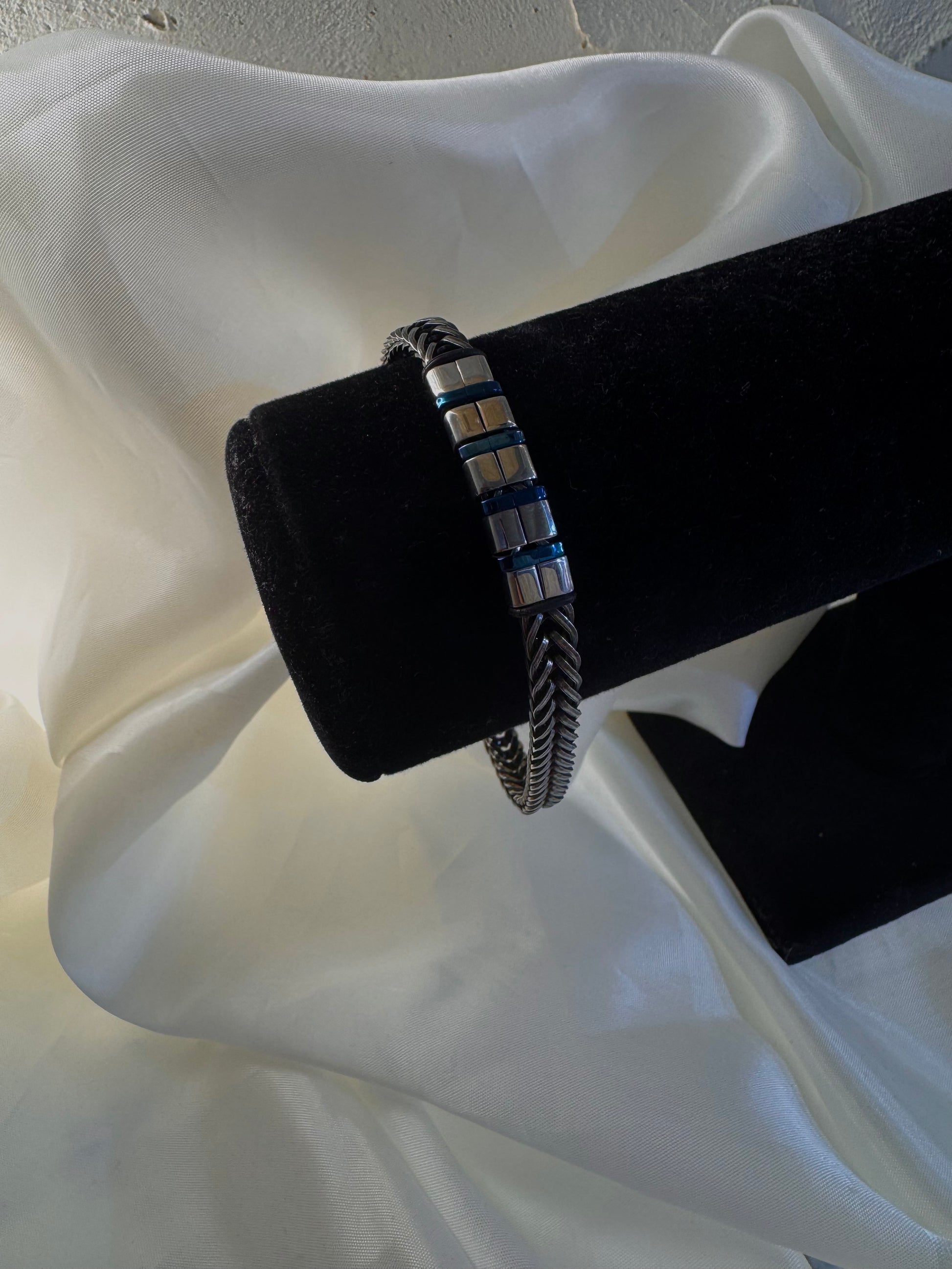 Ένα βραχιόλι με δυναμικό χαρακτήρα και industrial αισθητική. Το Titan Edge συνδυάζει τον ψυχρό τόνο του ατσαλιού με μπλε λεπτομέρειες, δημιουργώντας ένα επιβλητικό αλλά κομψό αποτέλεσμα. Η γεωμετρία του σχεδίου του χαρίζει σύγχρονη ενέργεια και απόλυτη ισορροπία.