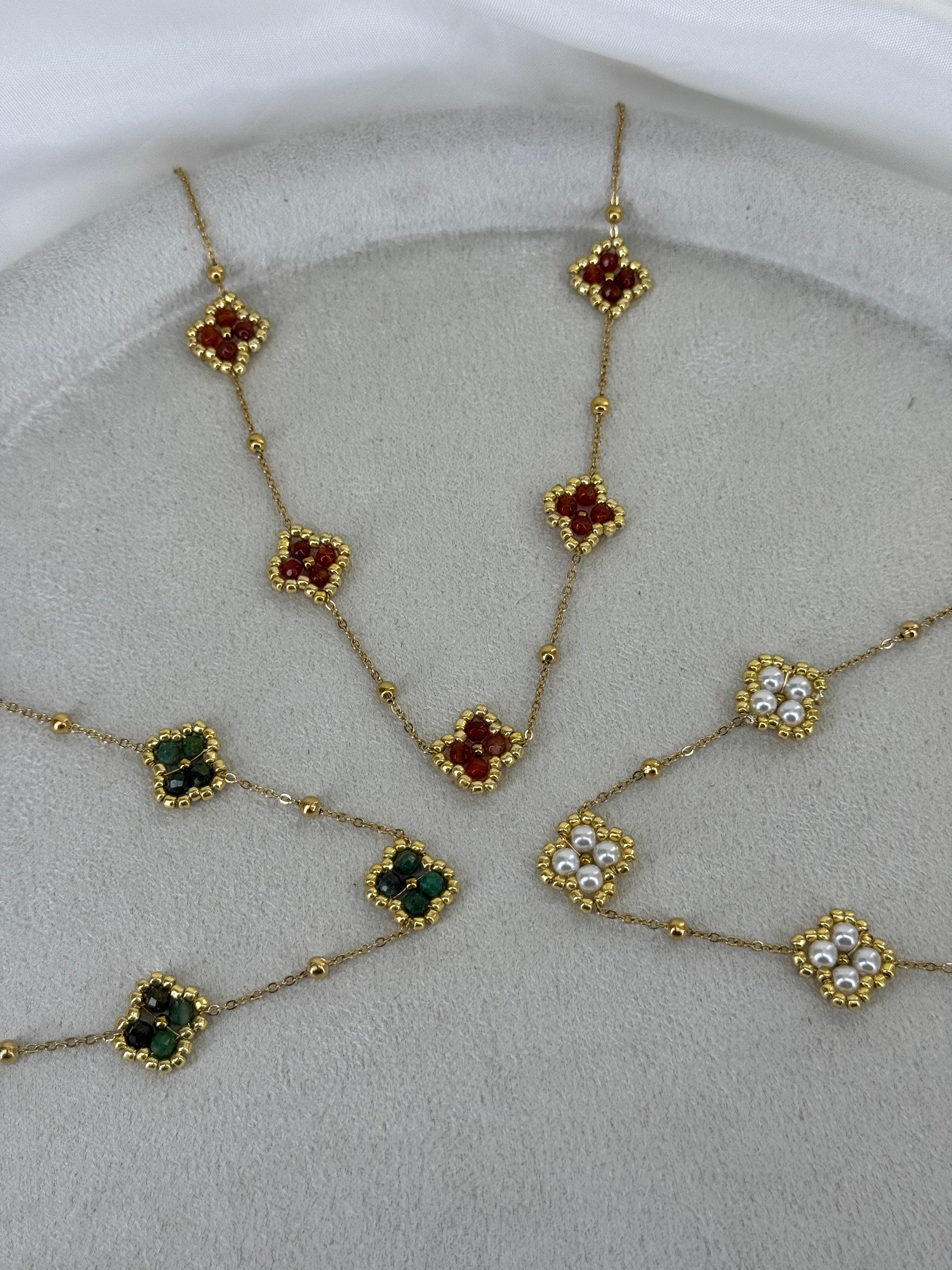Ένα εκλεπτυσμένο κολιέ που συνδυάζει διαχρονική κομψότητα με χρυσή λάμψη. Τα λουλουδένια μοτίβα, διακοσμημένα με πέτρες σε τρεις διαφορετικές αποχρώσεις (ζεστό καφέ, σμαραγδί πράσινο και λευκό περλέ), δημιουργούν ένα κόσμημα που μπορεί να φορεθεί από το πρωί ως το βράδυ. Ιδανικό για να προσθέσει μια αίσθηση πολυτέλειας και φινέτσας σε κάθε εμφάνιση.