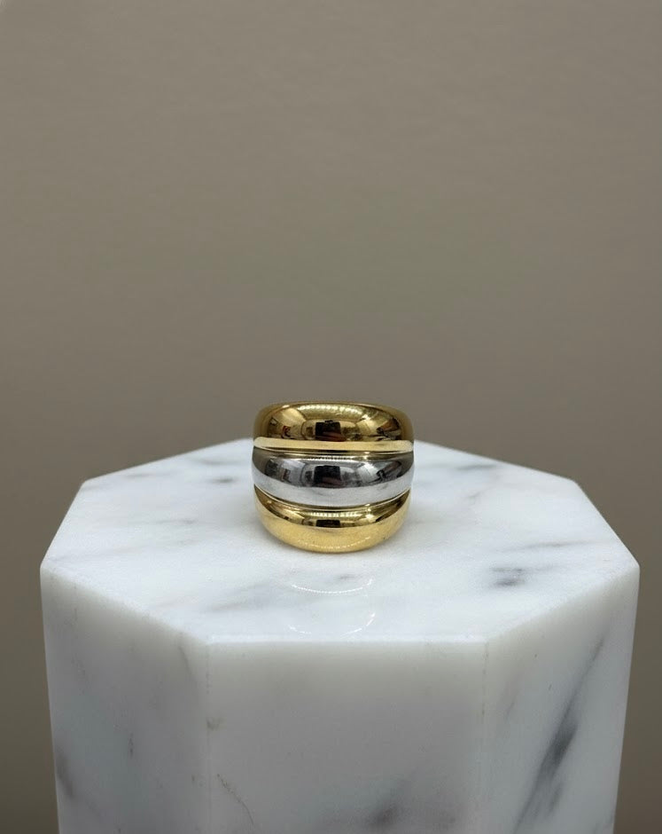 Ένα δαχτυλίδι που συνδυάζει δύο κόσμους σε μία ενιαία, δυναμική φόρμα. Το “Twin Harmony” παίζει με το χρυσό και το ασημί, δημιουργώντας ένα statement κομμάτι που αποπνέει ισορροπία, καθαρότητα και premium αισθητική. Κατασκευασμένο από stainless steel, παραμένει ανθεκτικό, λαμπερό και αναλλοίωτο, ιδανικό για εμφανίσεις που απαιτούν διακριτική δύναμη και μοντέρνα κομψότητα.
