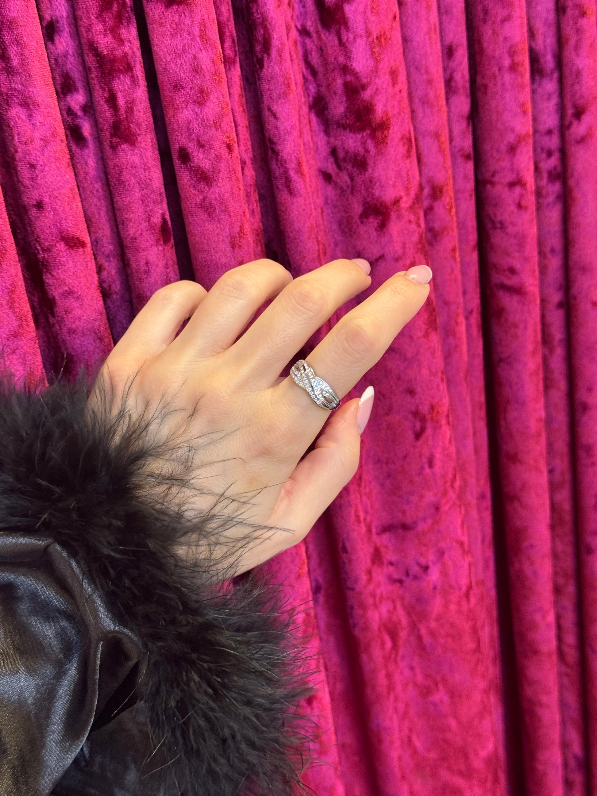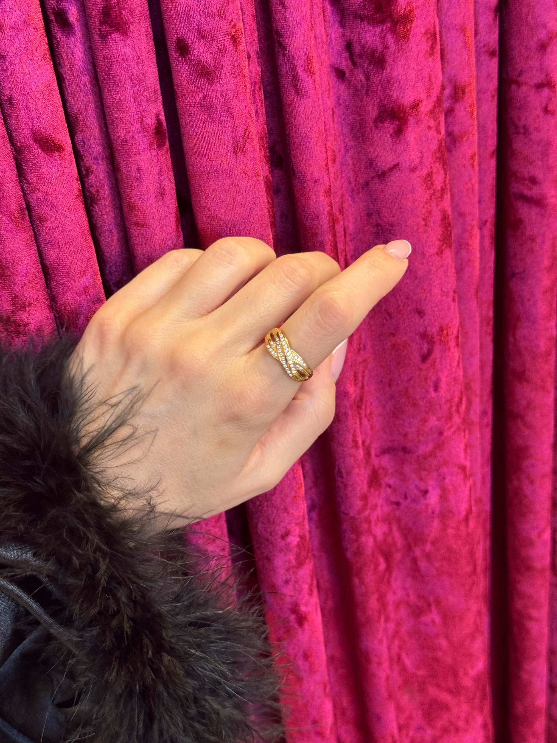 Το “Twisted Glow” είναι ένα κομψό δαχτυλίδι σε twisted crossover σχεδιασμό, διακοσμημένο με διάφανα ζιργκόν που δημιουργούν μια φωτεινή, ανάλαφρη λάμψη. Η καμπύλη γραμμή του αγκαλιάζει το δάχτυλο με δυναμισμό και θηλυκότητα, προσφέροντας ένα premium και διακριτικά εντυπωσιακό αποτέλεσμα. Ένα δαχτυλίδι που φοριέται άνετα μόνο του αλλά και σε layering για πιο glamorous εμφανίσεις.