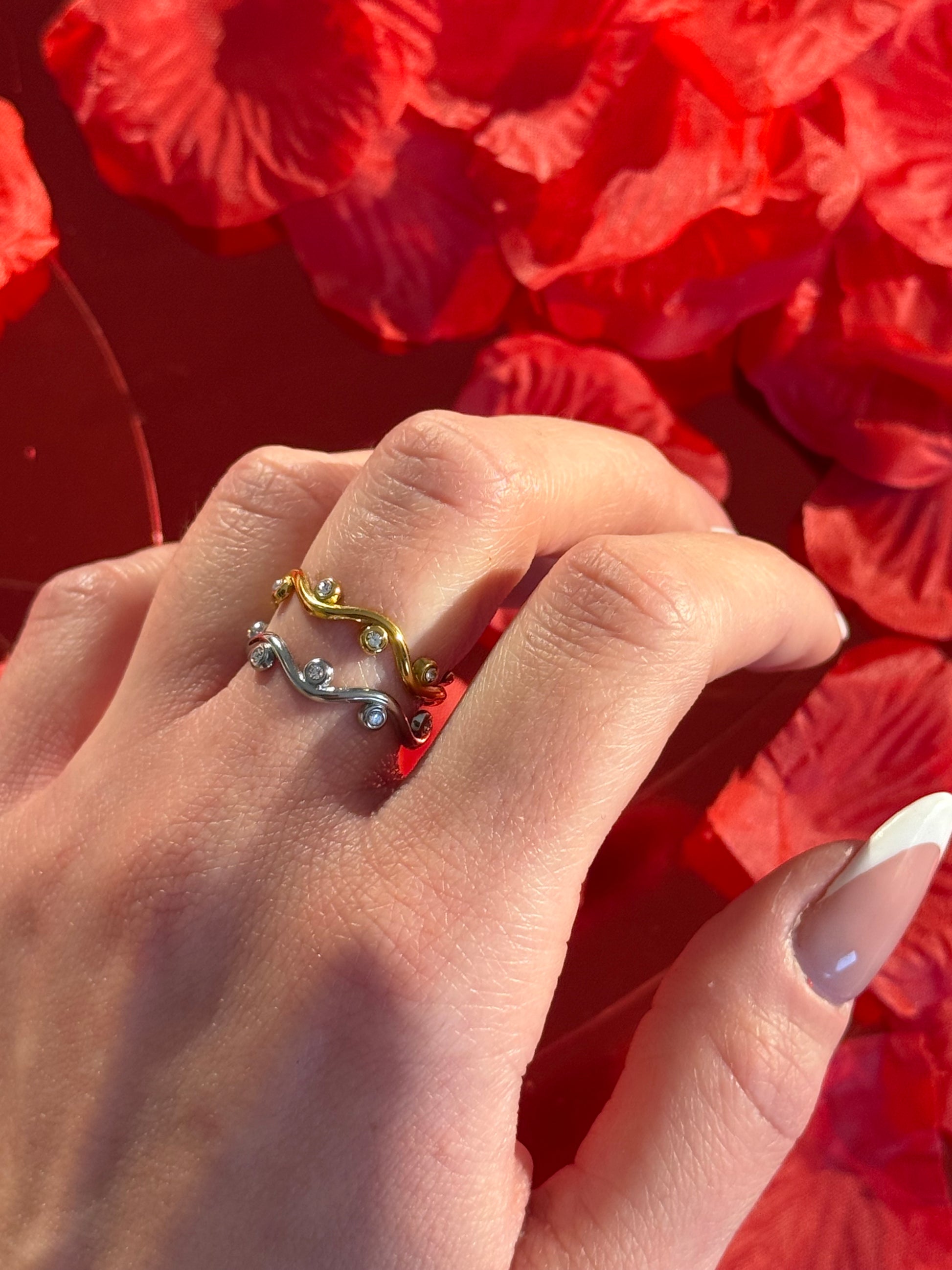 Ένα ιδιαίτερο δαχτυλίδι που συνδυάζει τον χρυσό και το ασήμι σε μια συμμετρική σύνθεση, αποπνέοντας κομψότητα και μοντέρνα αισθητική. Τοποθετημένο απαλά πάνω σε κυματιστό, λευκό ύφασμα, το κόσμημα μοιάζει να αιωρείται ανάμεσα στο φως και τη σκιά, συμβολίζοντας τη σύνδεση ανάμεσα σε διαφορετικά στοιχεία που συμπληρώνουν το ένα το άλλο.