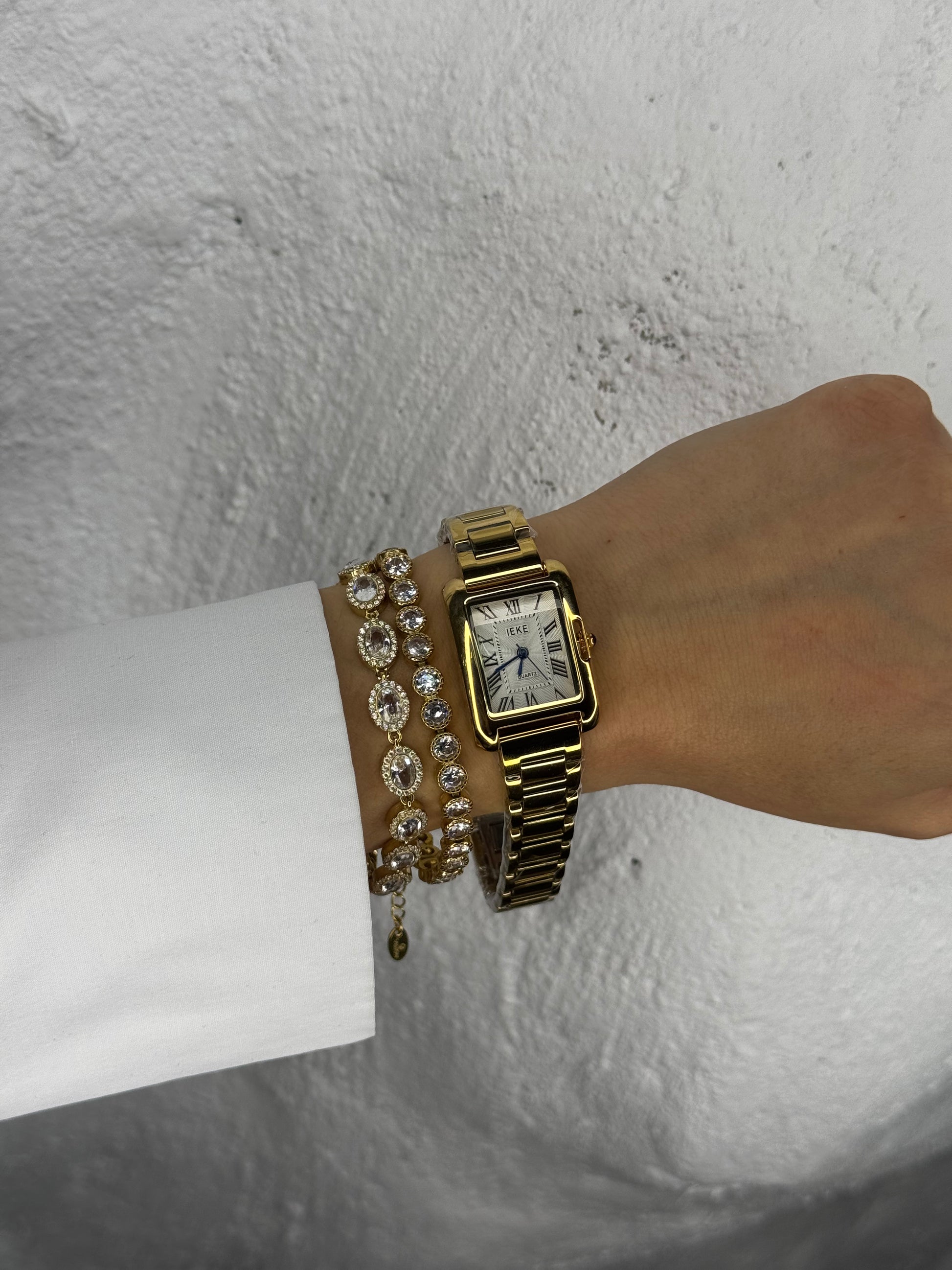 Το VALENTINA LUMIÈRE είναι ένα ρολόι που ακτινοβολεί φως και κομψότητα. Το τετράγωνο πλαίσιο του με ρωμαϊκούς αριθμούς και το λαμπερό χρυσό μπρασελέ από ατσάλι συνθέτουν ένα διαχρονικό κόσμημα που εντυπωσιάζει χωρίς προσπάθεια. Το design του αποπνέει αρχοντική φινέτσα, κάνοντάς το ιδανικό για γυναίκες που αγαπούν την κλασική πολυτέλεια με μοντέρνο άγγιγμα.