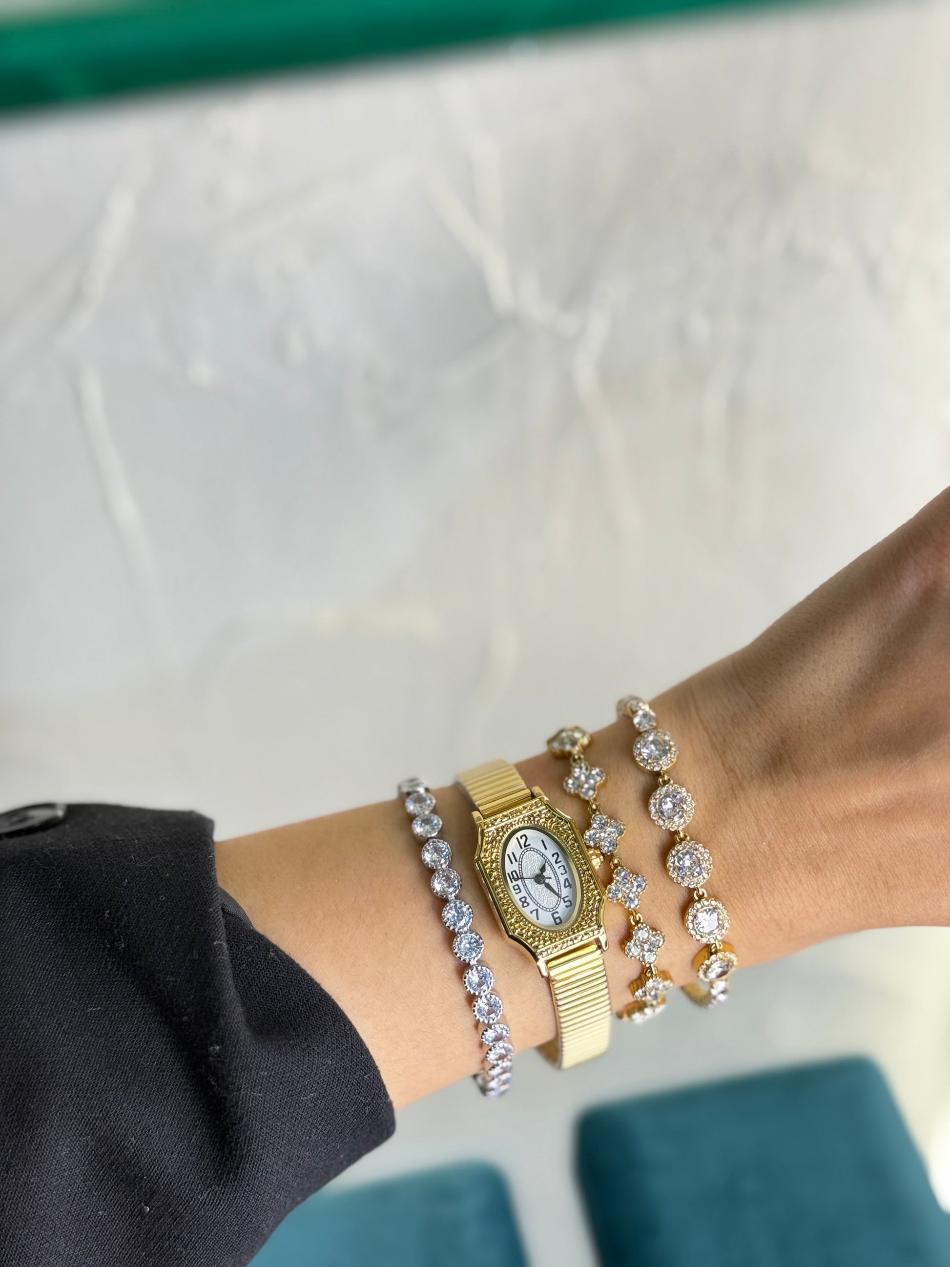 Ατσάλινο ρολόι σε απόχρωση χρυσού, με κομψή οβάλ κάσα και εκθαμβωτικό καντράν. Το Valentina Princess αποπνέει βασιλική φινέτσα και θηλυκή λάμψη — ένα κομμάτι που μαγνητίζει τα βλέμματα σε κάθε εμφάνιση.