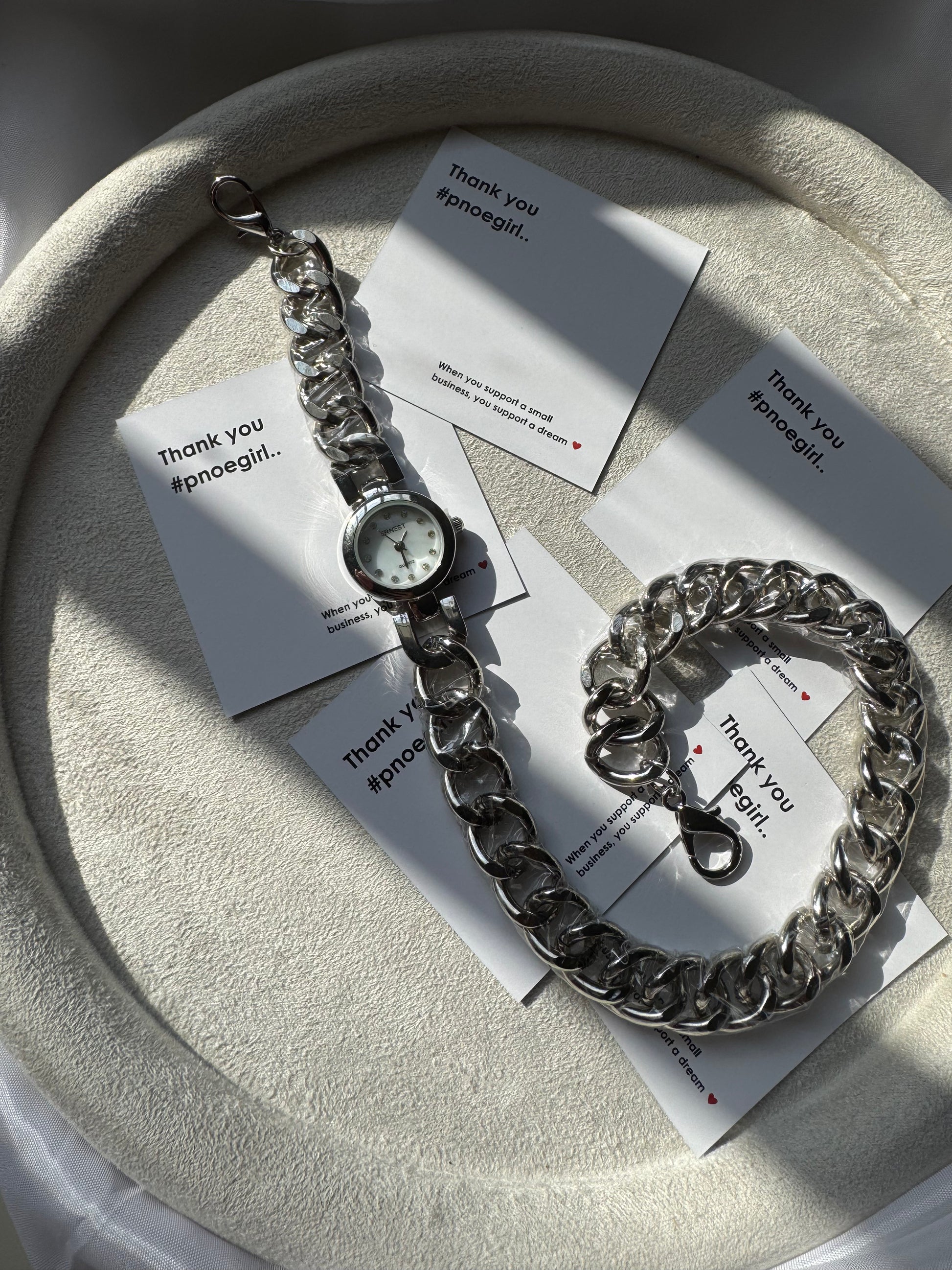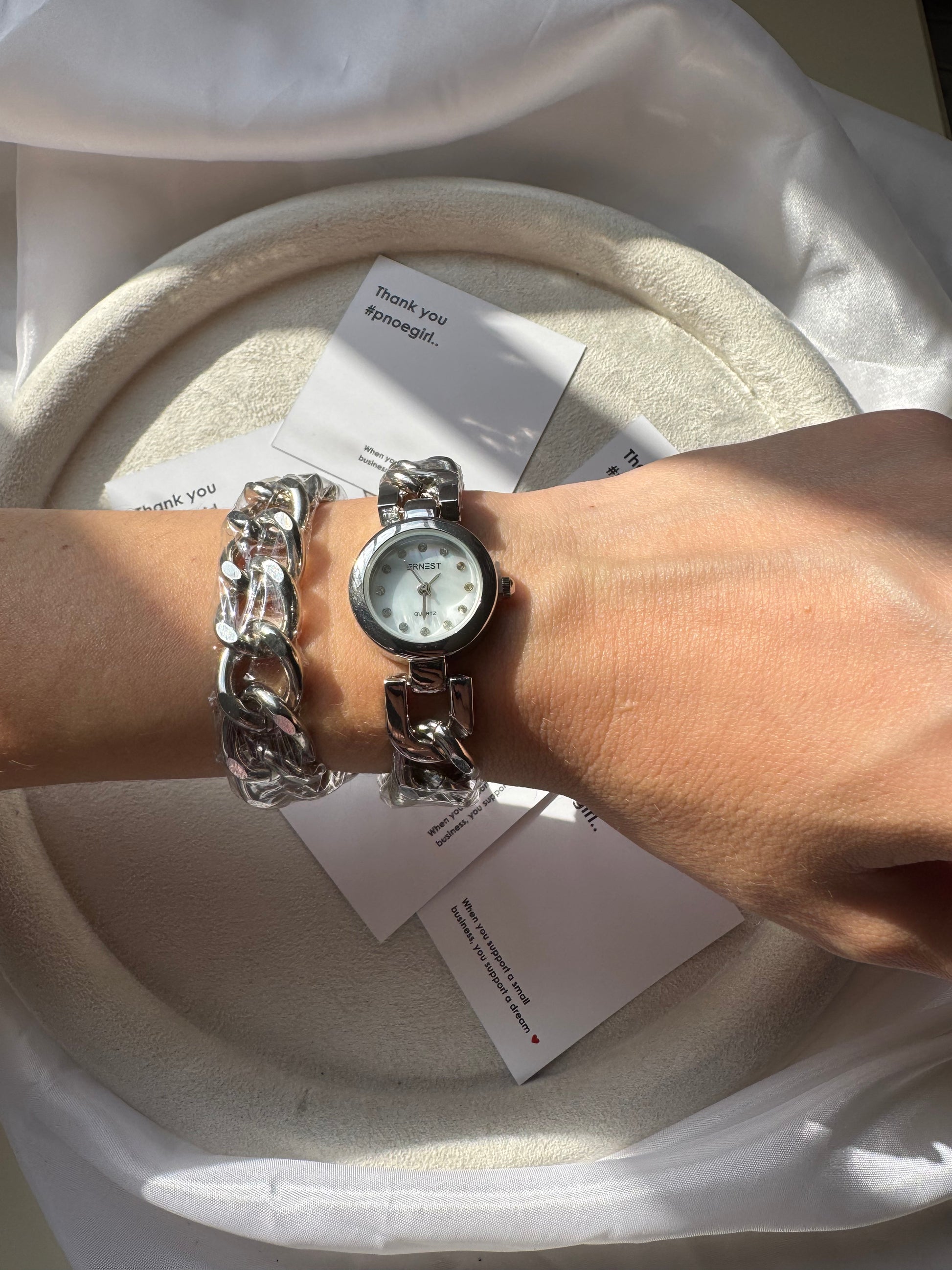 Το Veyra είναι ένα statement κομμάτι που ισορροπεί ανάμεσα στο ρολόι και το κόσμημα. Με μπρασελέ-αλυσίδα σε ασημί απόχρωση και στρογγυλό καντράν σε λευκό, δημιουργεί έναν δυναμικό αλλά ταυτόχρονα κομψό χαρακτήρα. Κατασκευασμένο από ανθεκτικό ορείχαλκο, προσφέρει στιβαρότητα και στυλ, ενώ φοριέται σαν βραχιόλι που ξεχωρίζει.