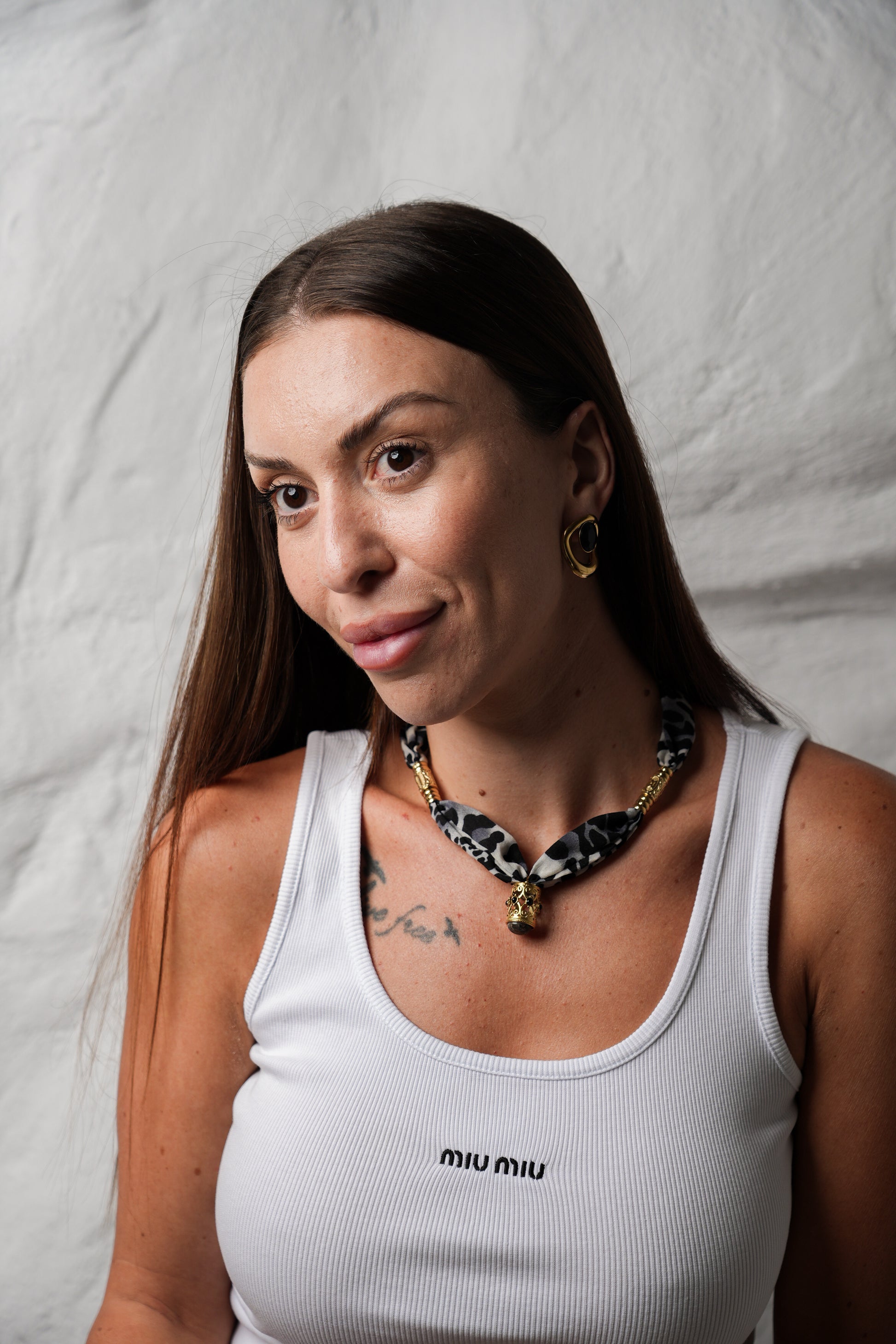 Ένα μοναδικό κολιέ με υφασμάτινη κορδέλα σε animal print και χρυσές λεπτομέρειες με περίτεχνα σκαλίσματα. Ένα κόσμημα με έντονο χαρακτήρα που εκφράζει ελευθερία, τόλμη και αυθεντικό στυλ.